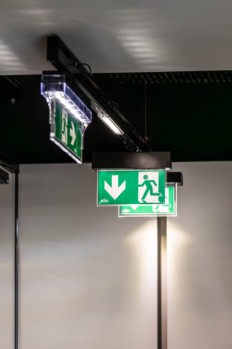 Das Lichtbandsystem E-TRACK bietet einen 230-V-Notlichtstromkreis und ist perfekt auf die Integration von Einzelbatterieleuchten der din-Sicherheitstechnik ausgelegt.
