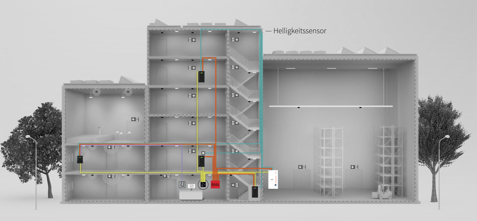 Um die Not- und Sicherheitsbeleuchtung bei Dämmerungsanbruch als energiesparendes Nachtlicht für das Gebäude zu nutzen, wird der Helligkeitssensor für die Nachtlichtschaltung mit dem nächstgelegenen Notlichtsystem verkabelt. Mithilfe der NET-Funktion wird diese Information an alle anderen Notlichtsysteme weitergegeben.