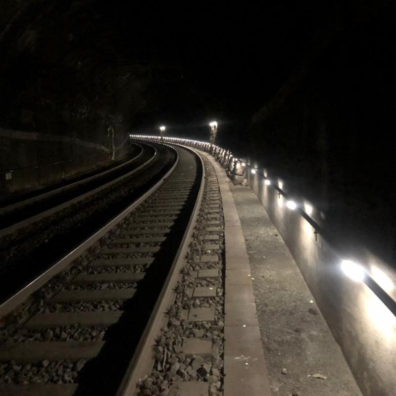 Im Jahr 2019 wurde sowohl der Handlauf mit Orientierungsbeleuchtung, als auch die Nischenbeleuchtung im Leideggtunnel in Tirol, normenkonform erneuert. Der Leideggtunnel ist 2-gleisig und hat eine Gesamtlänge von 327 Meter.