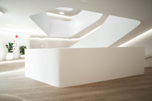 The large internal staircases, characterised by diagonal cuts, represent the element of rupture and allow the building to be perceived in its verticality. Around them, balconies with seating areas create spaces for lingering and socialising. The design decisions, which are based on the principles of neuroarchitecture, aim to define the ideal workspace. The sober overall appearance of the building reflects the seriousness and pragmatism of the company.