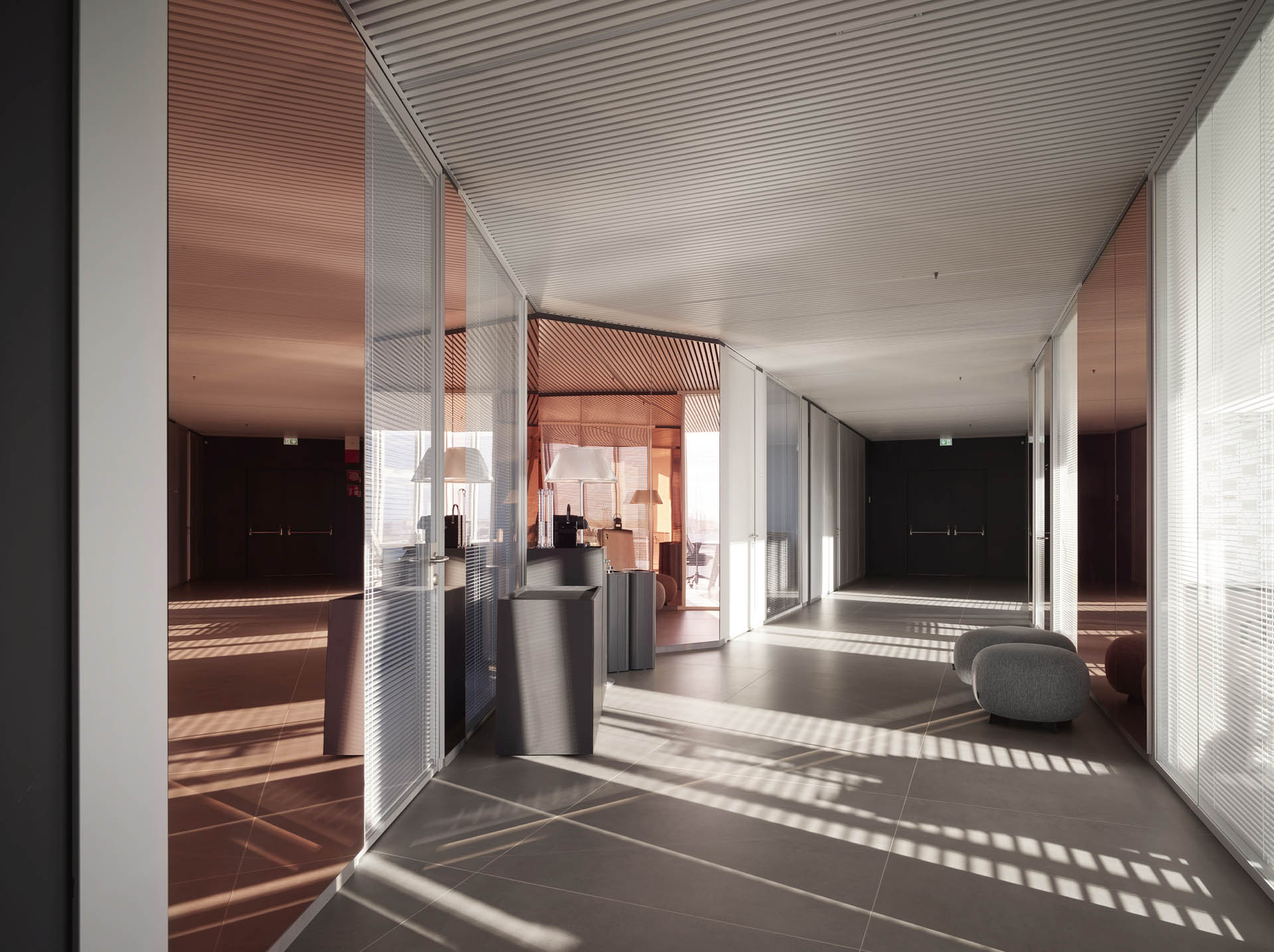 The Sidera extends horizontally over 100 metres and rises 33 metres above a base approximately 3 metres high. It was designed for maximum flexibility and dispenses with the open-plan concept in favour of single or two-person offices, with each of the six departments housed on its own floor.