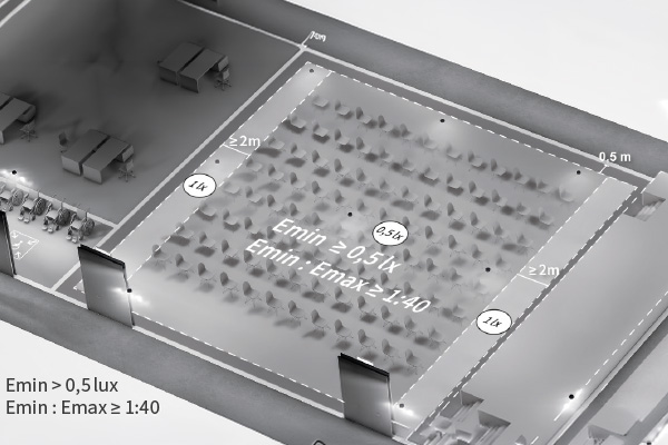 L’illuminamento minimo non deve risultare inferiore a 0,5 lux calcolati al suolo, ad esclusione di una zona margine di 0,5 metri lungo il perimetro dell’area. Il rapporto tra illuminamento min/max non deve essere inferiore a 1:40.