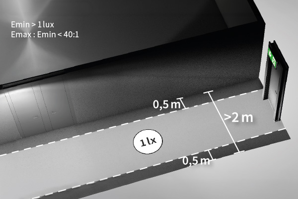 Questo tipo di illuminazione ha lo scopo di garantire il necessario illuminamento nei locali e nelle vie di sfollamento, attraverso percorsi identificabili mediante opportuna segnaletica, fino a un luogo sicuro. L’illuminamento minimo al suolo non deve risultare inferiore a 1 lux per tutta la larghezza della via di esodo, esclusa una banda laterale di 0,5 m (o ¼ della larghezza se inferiore a 2 m). Il rapporto tra illuminamento min/max non deve essere inferiore a 1:40.