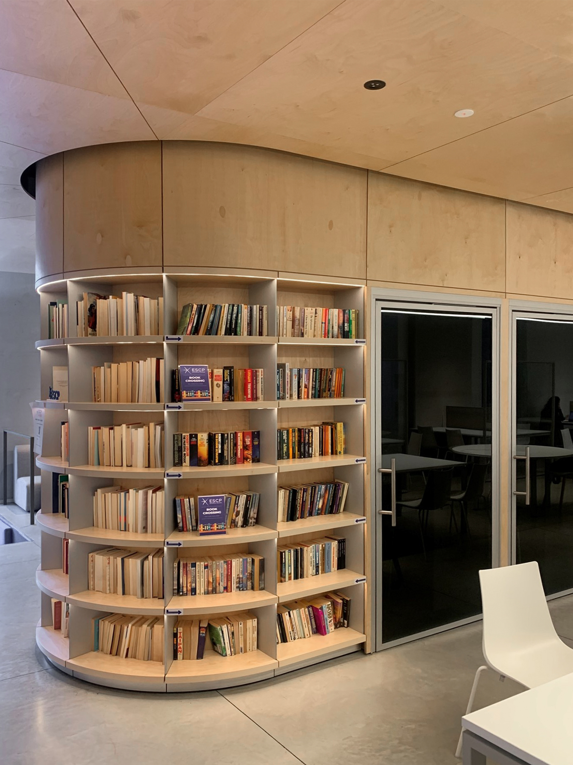 Gli spazi interni sono organizzati in modo chiaro e funzionale: il nuovo volume ospita l’auditorium e aule a emiciclo, mentre l’edificio storico accoglie uffici e aule tradizionali. Questa suddivisione permette una migliore gestione dei flussi e degli impianti. Al centro, la piazza coperta di circa 500 m² crea un collegamento tra i 1.500 studenti provenienti da tutto il mondo e la città.