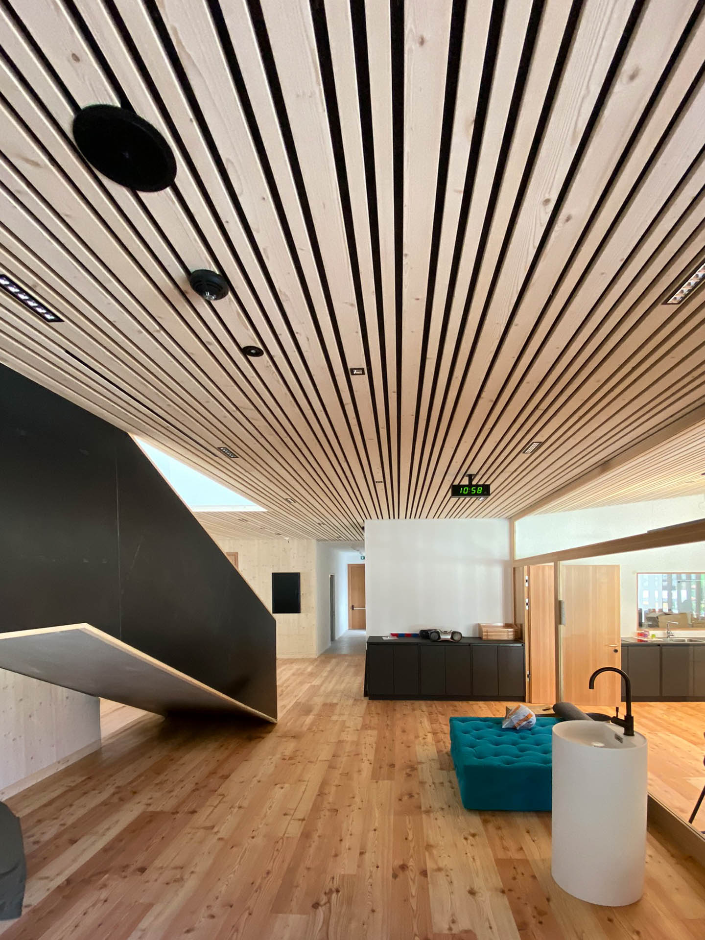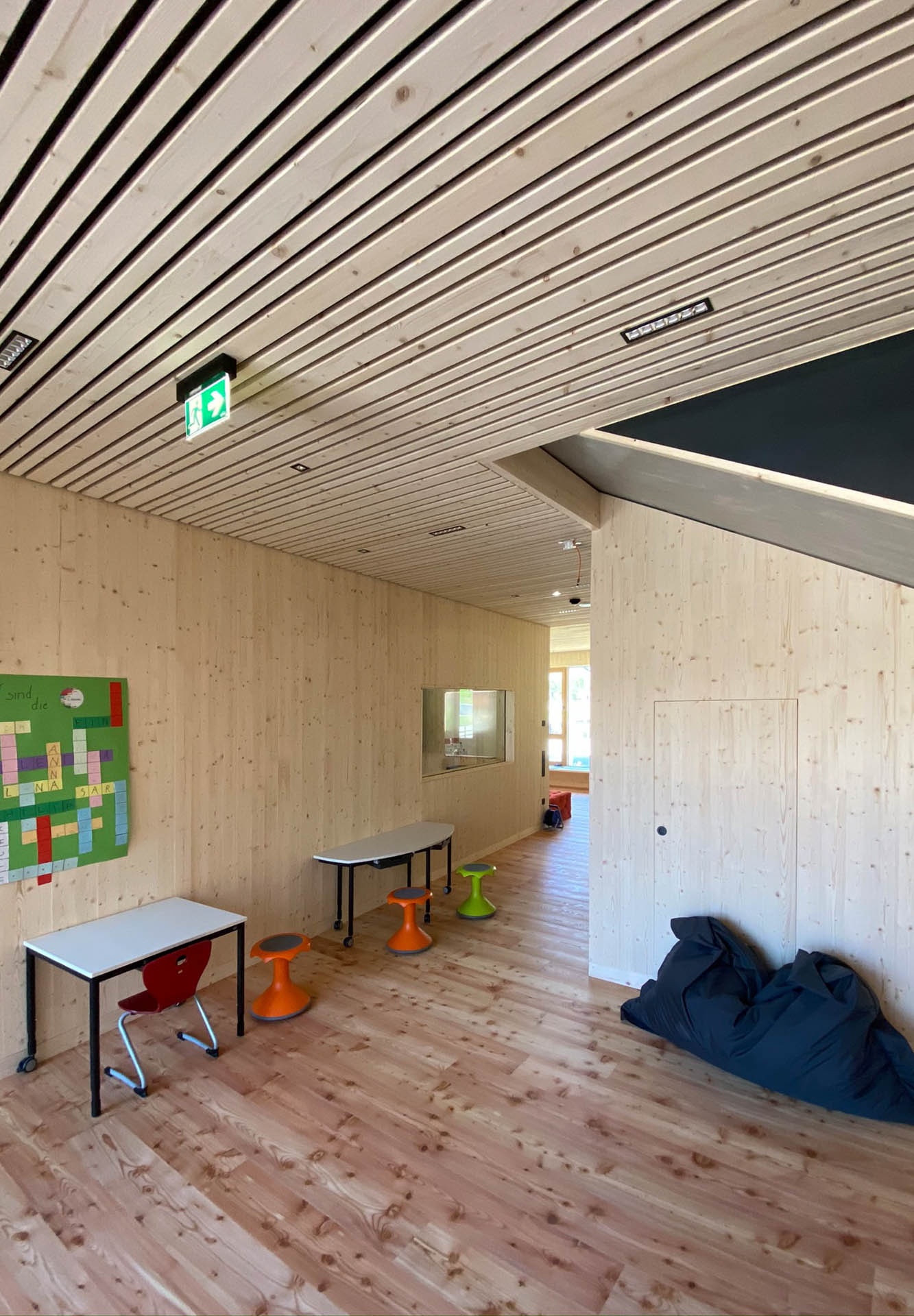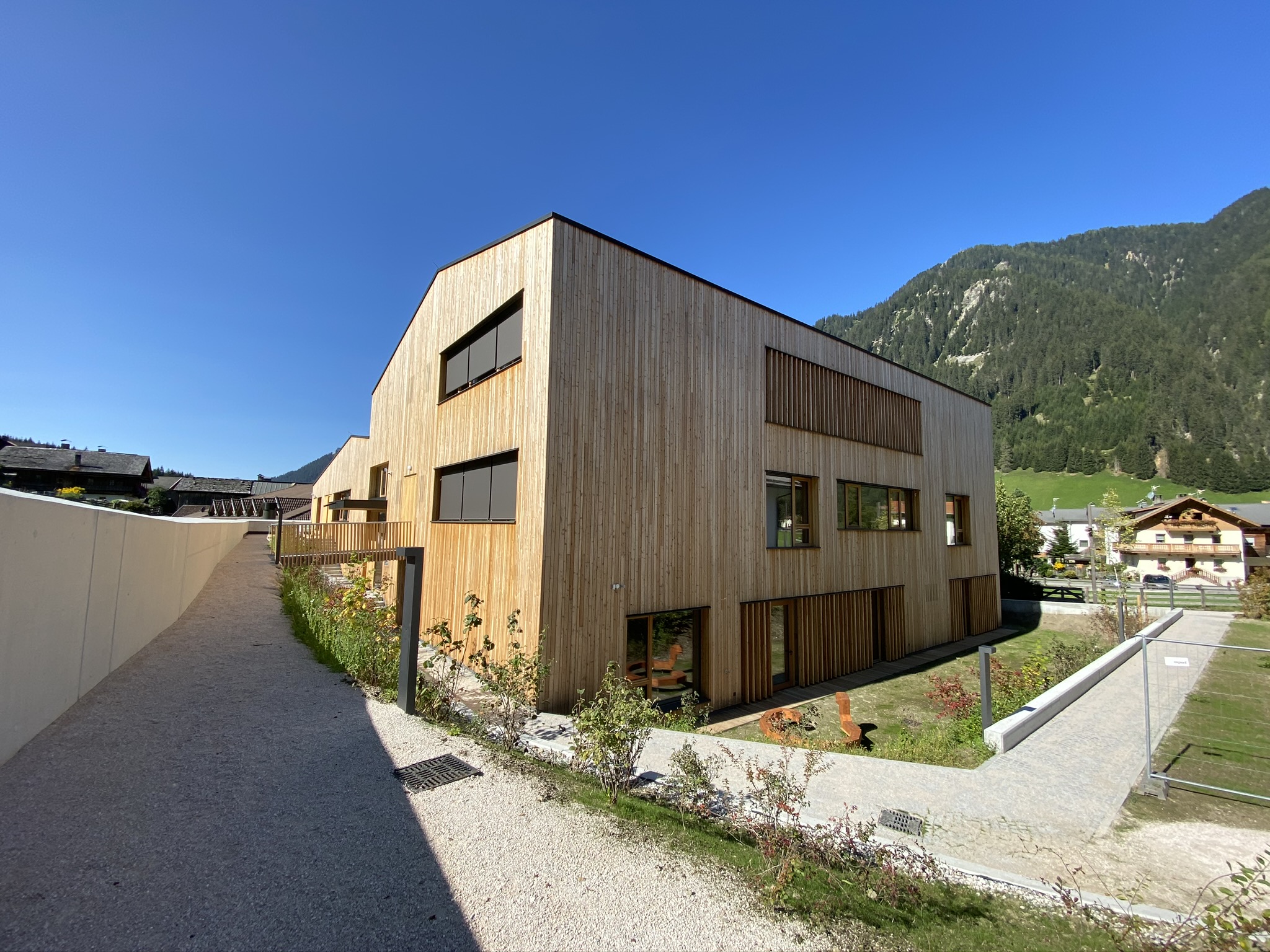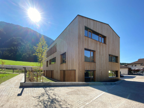 L’edificio si inserisce nel cuore del paese, adattandosi al pendio con volumi semplici e tetti a falde, in continuità con la tradizione. Costruito in legno, materiale rinnovabile e locale, unisce sostenibilità ed estetica, creando ambienti caldi e accoglienti.