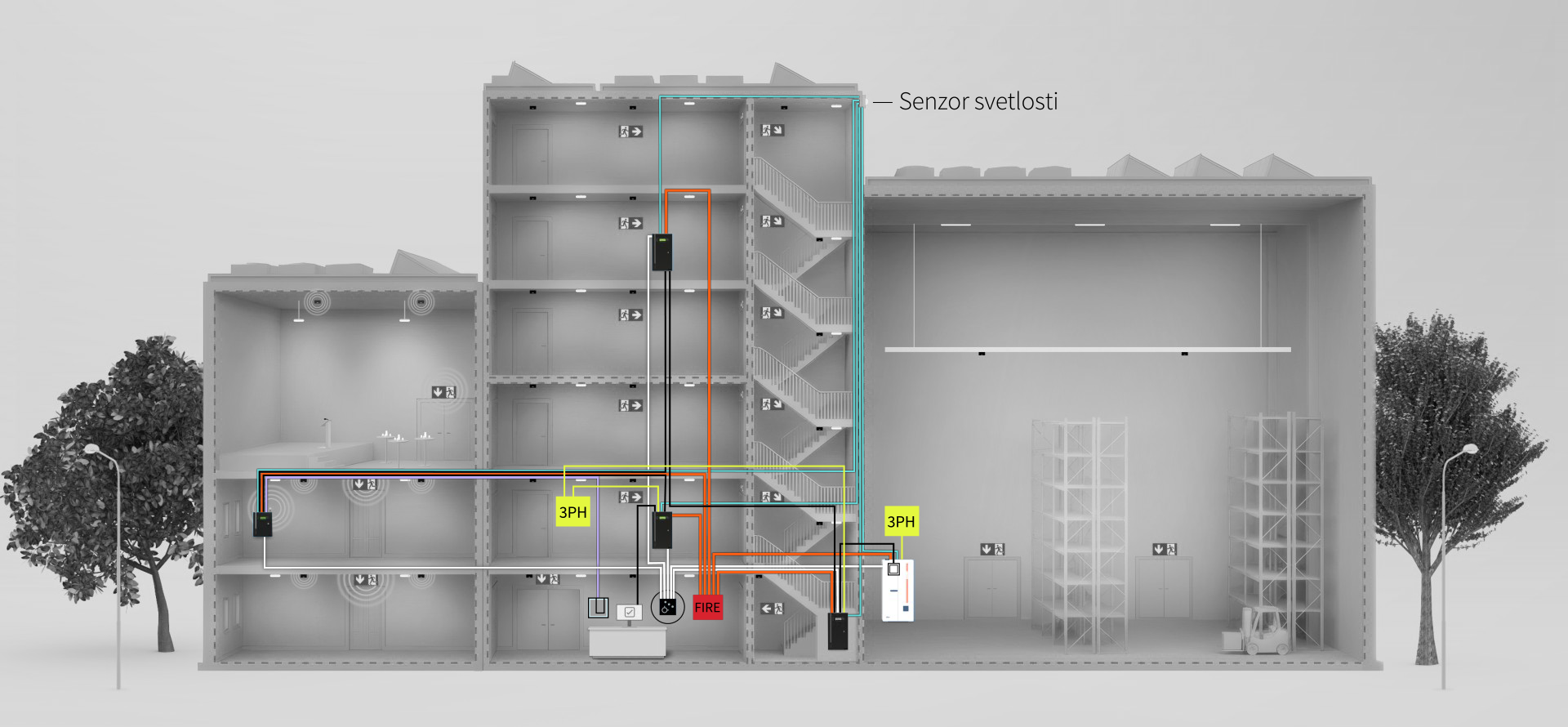 Namestitev po požarnih sektorjih zmanjša zahtevno in drago polaganje E30 kablov, ter zmanjša tudi stroške za elektro prostore.